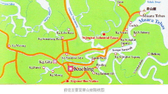 从古晋市区到青山(Kampung Muara Tebas)需要大约一小时的车程,车子在跳跃的马路上奔腾,随后转入一个不是很起眼的小路,路旁的水沟里长了许多美丽的睡莲,随后抵达小渔村(Kampung Muara Tebas),小渔村的尽头山丘上就是青山岩啦!