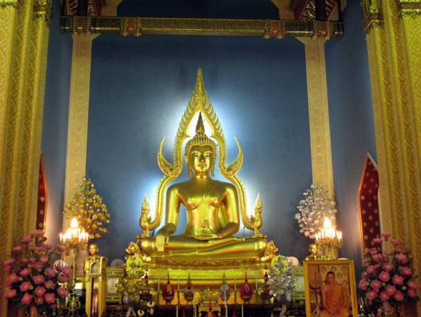 主殿大门两侧有石狮子守卫,殿内供有一尊高约3米的释迦牟尼金佛。主佛殿中的清拉佛像,是泰国著名彭世洛佛像的复制品。
