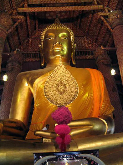 Wat Phananchoeng situated on the river bank south of Ayutthaya; it is surrounded by attractive grounds with bushes and hedges trimmed in contorted shapes. A massive golden Buddha-image seems to peer down at the people as they enter. The image is believed to have been created in 1324, twenty-six years before Ayutthaya was founded. Later, during the Ayutthaya period, the temple building was put up around it. The Buddha is highly revered since, according to legend, tears came from its eyes the day Ayutthaya was sacked by the Burmese. The Chinese community has taken care of this temple for some time and decorated the hall inside with Chinese lanterns. One may walk around the Buddha and see the niches in the walls and the details of the decorations.