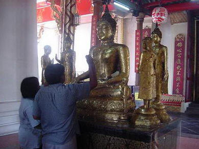穿过走廊可以到另一间较小的佛殿,里面供奉三尊金佛,最左边的那一尊是纯金做的。相传是西元1357年,艾尤塔雅与缅甸人时常作战,为了怕缅甸人抢夺,大家便决定把家里的金子都拿出来塑成佛,再用水泥包起来,直到西元1956年,一位和尚打扫时,包着的水泥崩落,才露出里面的金佛。