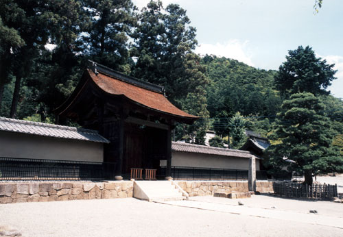四脚门歇山式屋顶,室町时代。左右两侧延伸的筑地塀(瓦顶泥墙)为县级指定文物。