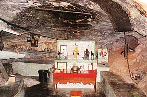 我们随著继隆法师走到大雄宝殿佛桌的后面,进入石洞。石洞不大,可是尽是奇形怪状的钟乳石。继隆法师停下来,指向一个稍为宽敞的空间,我们看到的是一间小茅篷,旁边还有一张小佛桌。我的脑海马上浮现当年继隆法师独身来此的情景。