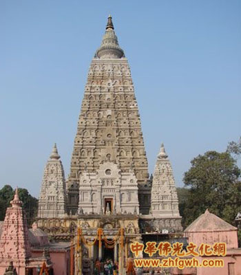 菩提伽耶是释迦牟尼佛悟道的地方,为印度佛陀八大圣地之一。当年阿育王为了纪念佛陀在此成道,在菩提树的北边建造了一座大塔。中国唐朝玄奘大师游历印度时,曾对此塔及附近的其他遗迹有详细的记载。目前雄伟壮观的正觉大塔是十三世纪时由缅甸国王重新修造的,塔高五十二米,外观九层,内部两层,四面刻有佛像佛龛,雕镂精致庄严,是阿育王时代几何图形的雕刻。塔中有佛陀的金身坐像,周边另有四座小塔围绕。