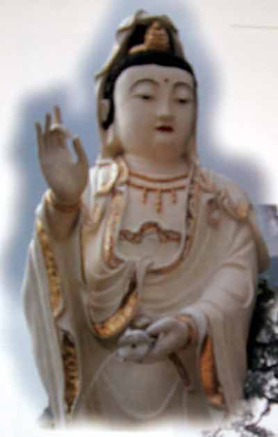 新建成的妙宗寺,大门外尚刻着佛润园的旧名。大门内的庭园,迎面是一座玻璃纤维敬塑的白衣观音,手持宝瓶,伫立在莲池之上。在远处群山映衬下,更显观音大士的慈悲庄严法相和霭。