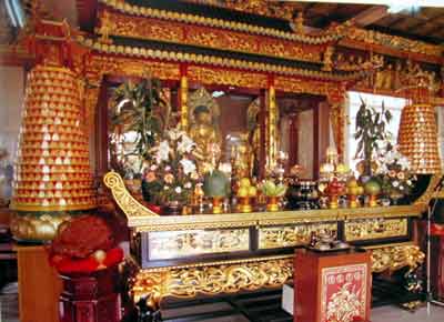大雄宝殿金光灿然,三宝佛法相庄严,令人景仰,两旁诸天,造像精致