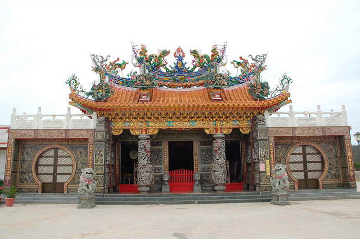 虽是佛寺,但与地方信仰是混合的,其建筑寺前有一对石狮镇守,龙柱雕刻精简:金黄色琉璃瓦,燕尾脊梁设计有各种龙飞凤舞,屋脊上雕有双龙拜珠及檐角仙人异兽:内殴“慈悲济世”匾额下观世音菩萨法相庄严的气氛,令人肃然起敬;外殿“保境佑民”为数十尊道教神只;庙宇雕龙画栋、金碧辉煌:另有左右厢房为佛事用具及信众休息之处。