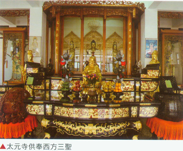 太元寺为地上2层,地下1层的宫殿式建筑; 大殿供奉西方三圣。正殿後面供奉地藏王菩萨,并接受市民寄放祖先牌位,左侧则供奉太元堂斋教祖师牌位。2楼佛宠供奉释迦牟尼佛、文殊菩萨、普贤菩萨,龛前佛桌供奉开基的观世音菩萨。地下土楼作为法会场地,或借给社会人士作讲堂、法会场地。
