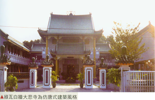 大悲寺为仿唐式建筑风格,绿瓦白墙。入门右侧有一雅致小木屋,作为禅堂使用。大殿挑高2层,供奉释迦牟尼佛。