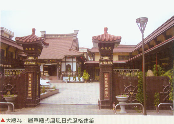 大殿为土层单殿式唐风日式风格建筑,供奉观世音菩萨。左侧有地藏殿与大殿平行。两边各有2层楼建筑,作为讲堂及寮房。