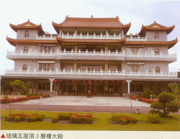为3层大殿,配以琉璃瓦,供奉三宝佛。前院供停车场及花园广场之用,後院划为菜圃果园及大寮。