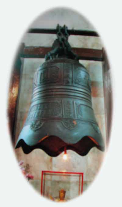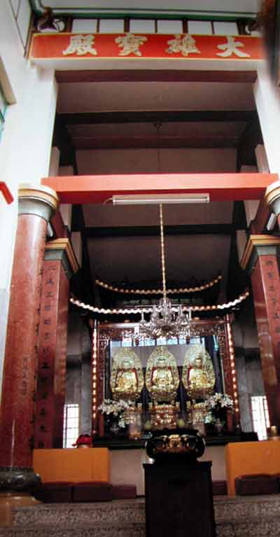 进入正门的大雄宝殷,修建古朴而明朗,殿内建筑明显有广东寺院的釆光特色,高而雄伟,光源来自天顶透光密封天窗。三宝佛像的龛台,置於台阶之上,肃穆庄严;两侧红色圆柱,雄浑拔挺,上书联曰:“四智三身俱透脱何须共住黄金,六通五眼总圆明正可同参大殿”。殿内并供奉韦驮菩萨,两傍钟鼓高悬。