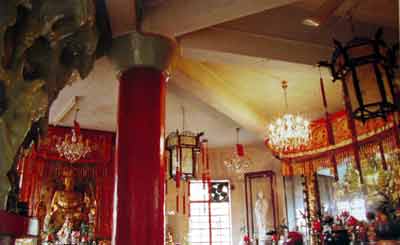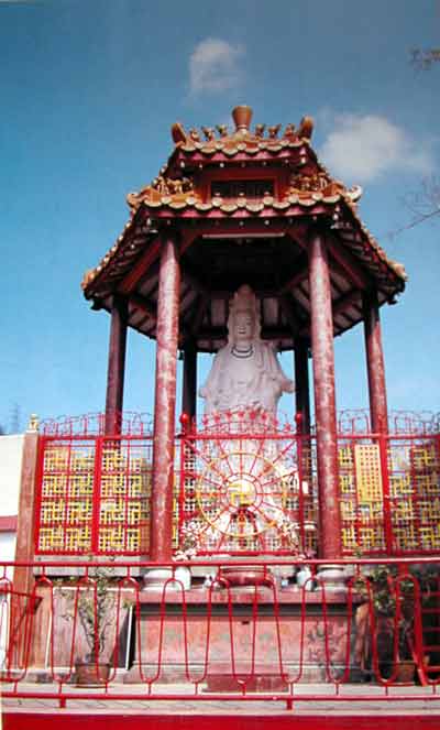 香海慈航,俗称船庙,顾名思义,可见是一别具建筑特色的道场。其外观一如宝筏,喻意大乘佛教。寺内主要供奉观音菩萨,志名“香海慈航”,有普渡众生之义。其建筑外型参照往来於南中国海上之渔船,建於荃湾老围村三叠潭之畔,状若破浪乘风,直朝荃湾市区进发。前舱为虚云禅师纪念堂,内有虚云禅师纪念塔,供奉三宝佛像;後舱为圆通宝殿,供奉千手千眼观世音菩萨、地藏菩萨。殿内另供奉两尊观音像,一为白衣,一为黑衣,遥遥相映;中间船舱为开山祖宽宗大师纪念堂,内供奉宽宗大师法相。