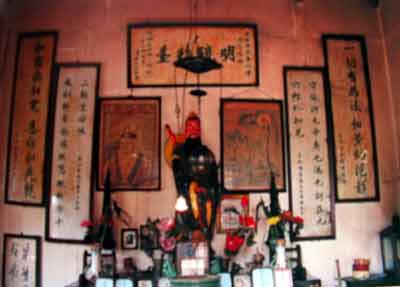 船头伫立关公宝像为护法,船尾静立观音菩萨立像一尊,慈视众生。中有船桅,法旗飘扬。