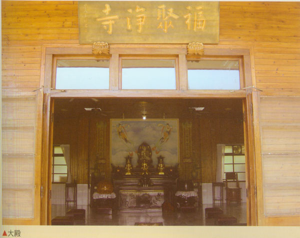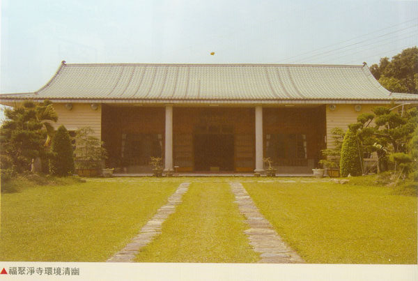 後因有人发心来学佛修行,法师遂兴起将精舍整建之念,遂加盖1间小佛堂,左右两边各1间小寮房:在拮据的建设经费中,兴建上半边为木头,下半边墙为砖块之建筑,所有材料、柱杉均来自废弃建材,供人众安住、办道,当时名为弘道精舍。民国83年,於佛堂右侧空地又新建1间铁屋,新的佛堂为日式建筑风格,室内摆设原木家俱、艺品,古色古香,窗几明净,林野清幽,也让住众能将身心安住在此地用功修行,定寺名为福聚净寺。