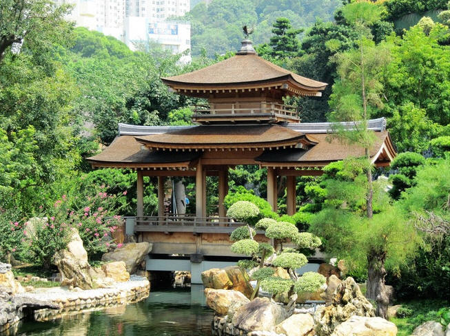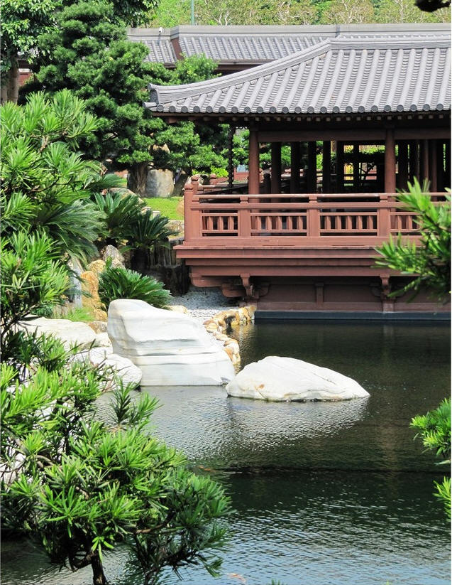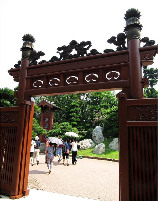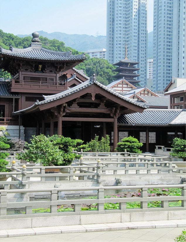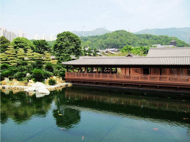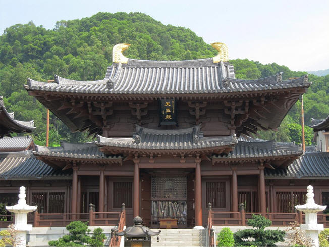 志莲的仿唐建筑分两进,是以四合院形式,顺依山势而建,南面为山门所在,气势开扬;东边有回游式山水园景,曲径通幽;西边有唐式枯山水庭园,禅味盎然。山门首进是四个莲池,盛放朵朵芙渠,表徵人间净土的所在。穿过敦煌经变式“双楼加一殿”布局的大王殿(内奉天冠弥勒佛、韦驮及四大天王)和其左右的钟鼓楼,便是第二进建筑群,亦是全寺的中心点。庄严浑厚的大雄宝殿,供奉释迦牟尼佛、文殊菩萨、普贤菩萨、迦叶尊者及阿难尊者,两旁配观音殿和药师殿,使主殿倍觉巍峨。第三进是收录大量佛教珍贵文物经典的藏经阁和法堂。在寺院东北面高处,耸立着一座寓意崇德报恩的七层万佛宝塔。