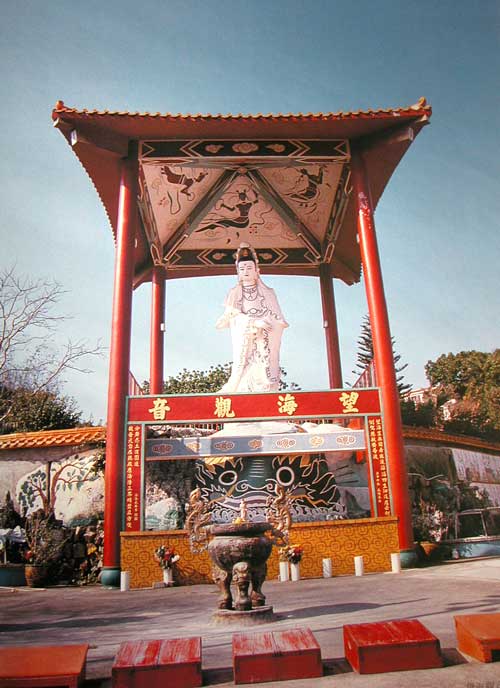 1975年,宝峄法师在殿後建造了一座望海观音像,耗资两万多元。望海观音像像高五十尺,面相慈祥,白衣素服,手持玉瓶,脚踏鳖鱼。像下的一对联堪为写照:“望海岂无因,看识浪滔滔,四生汨没应云何,倒驾慈航齐普渡;观音元自在,听声尘浩浩,三界烦嚣且方便,分身忍土演圆通。”望海观音像下两旁护山墙後来装饰了四十幅瓷砖拼画(每幅拼画用砖块廿八件) ,描绘了佛陀,观世音菩萨三十二应身事迹,活灵活现。