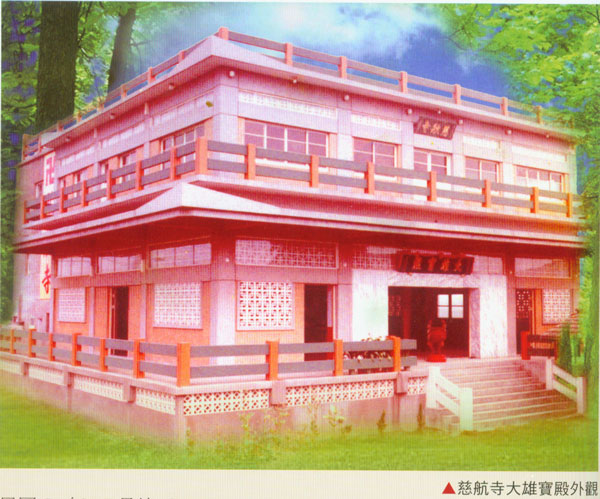 慈航寺大殿风格采淳朴中国式宫殿建筑,外观结构平凡中蕴聚著不凡的气势,占地100坪的大殿内供奉著观世音菩萨,大殿上层则收藏《大藏经》以供研修。殿前中央安奉l座十方炉,时而香烟袅袅气蕴藏禅。庭园内百花齐放,波罗蜜树下几张石凳子,围绕著青松翠绿、绿荫盎然。