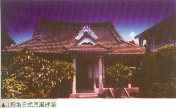 主殿为日式唐风建筑,供奉华严三圣,佛殿之基座、基身、屋顶之比例十分协调,殿外有一“冂”字型回廊的环绕,两头尽头为小巧拱门,形成一个户外绕佛的中介活动空间。右侧2层楼建筑,土楼为厨房、斋堂,2楼则是讲堂、禅房、寮房。
