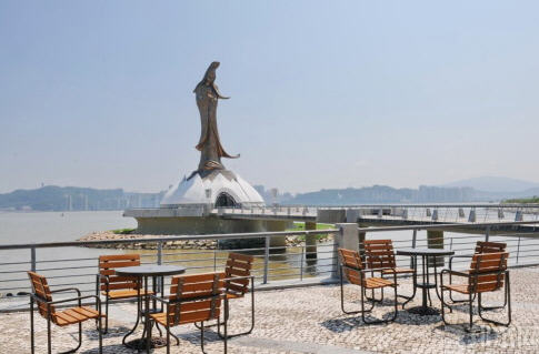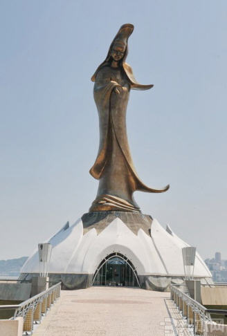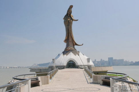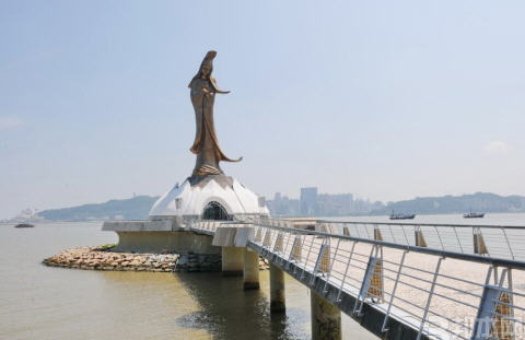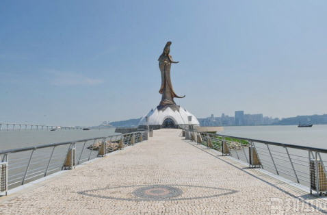 望海观音像座落在澳门新口岸新填海区的海面上,由葡籍雕塑家李洁莲设计,南京晨光集团公司铸造,铜像高21米,造价达3,000多万澳门元。30多件铜铸件。于1998年7月底陆续运抵施工现场,由於外籍雕塑设计师构思,观音像与传统的观音容貌有差异, 造型简洁流畅,具有中国传统佛教文化与欧洲雕塑相结合的风格。观音像的莲花基座设计为一座直径长19.5米的半球体建筑,是一个佛教文化中心,中心楼高两层,建筑面积约600平方米,地下一层为图书馆, 并以卡通、连环画、音乐等多媒体形式,介绍儒、佛、道三大东方宗教信仰及文化,上层为一个陈列宗教物品的展览厅,座放观音像的人工岛与新口岸新填海区堤岸之间由一道长60米的行人通道接通,行人通道、人工岛地面铺砌葡国石砾,观音像的安装工程及佛教中心的内部装饰工程於1999年春竣工,整个佛教中心的开幕仪式於1999年3月举行。