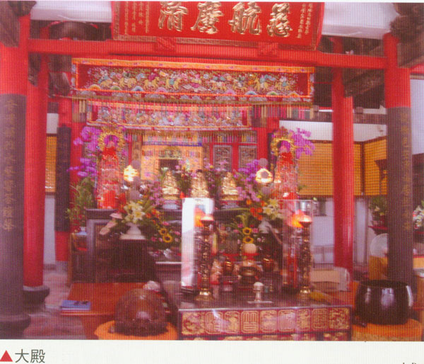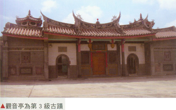 观音亭为澎湖第一古刹,淡红色的燕尾檐角高耸、瓦片麟鳞的接成一个个弧形;寺墙雕刻古朴,虽不是雕梁画栋,却也嵌满古色古香的石窗、花草石雕及人物塑像。寺内外的石柱上,到处是发人深省的对偈。大殿供奉南无本师释迦牟尼佛、南无阿弥陀佛、南无药师佛。内殿供奉南海观世音菩萨,十八罗汉分侍两侧,各个表情唯妙唯肖、神态生动,使大殿增色不少:右厢房省善堂内供奉药师菩萨、释迦牟尼佛、地藏菩萨:另偏殿辟有关圣帝君、南北斗星君、药师佛室;左厢房供奉海龙王,另偏殿有三宫大帝、福德正神、太乙真人室,以供信徒膜拜。