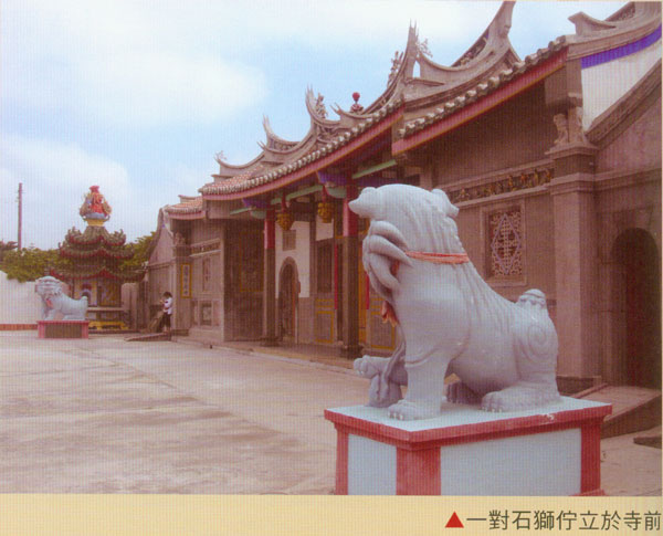 寺前一对狮子是清光绪13(1887)年建造,日治後於昭和12(1937)年从清代澎湖总镇衙署前移来的灰泥雕塑(由林勇、彭海乐两位师傅利用石灰、黑糖水、糯米浆搅和混炼成材塑造) 。寺前古钟则是光绪13(1887)年旧物,民国69年曾由海军澎湖第2造船厂协助修护。