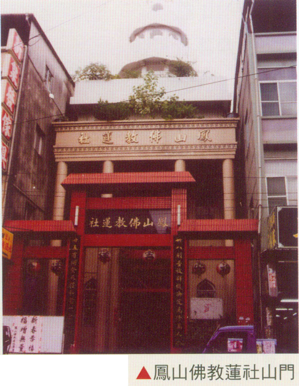 民国42年,陈神赐居士于龙山寺结佛学社,参加者众:旋因意见不一,多位会员退出龙山寺。嗣有李迁、陈天赐、姚登榜居士等,于41年购得三民路102号民房,成立凤山佛教学社,由姚登榜居士任董事长。翌年春,礼请煮云长老担任住持,道场更名为“凤山佛教莲社”。讲经弘法不断,原有民房不敷使用,遂由莲社董监事诸公发心,购得现址共140坪。53年兴工,翌年竣工:设讲堂、佛殿、藏经楼及住众寮房、厨房等。57年成立佛教莲社青年会。61年成立佛教莲社妇女会。62年扩建大雄宝殿,增设地藏殿,历时3年完工,於66年举行落成典礼。