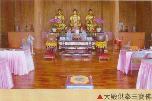 主要为渐层式2层建筑,1楼作为斋堂,2楼为大殿,供奉三宝佛:左右另有2栋双层建物,作为寮房及斋堂使用。
