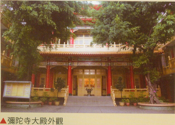 重建后之弥陀寺,全部采仿唐朝宫殿式之建筑。山门宏伟壮观,左右各有一尊护法菩萨,身著武官服饰,扬眉媢目,威严赫立,由山门进入中庭,种植榕树,两边有二丛菩提树及奇花异草,眼光乃为之一亮。左右是三层钟鼓楼形(而不悬钟鼓,钟鼓乃悬于殿内)。东厢楼下为民众阅览室,西厢楼下设置“服务处”,供信众请教佛法及登记助印经书佛像,赈灾济贫、自强朝圣等一切活动咨询处。