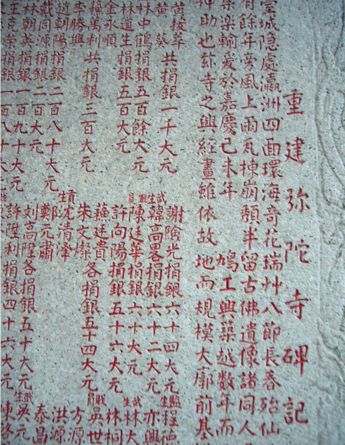 及至民国六十年春因缘成熟,弥陀寺奠基重建,历十载星霜,于焉古刹重现,巍峨殿宇,金像辉煌,讲堂禅房,焕然一新,又一俱时代之创建耳。此圆斌法师倡导之愿力与夫十方佛徒发心之挚诚,功德不可没也。