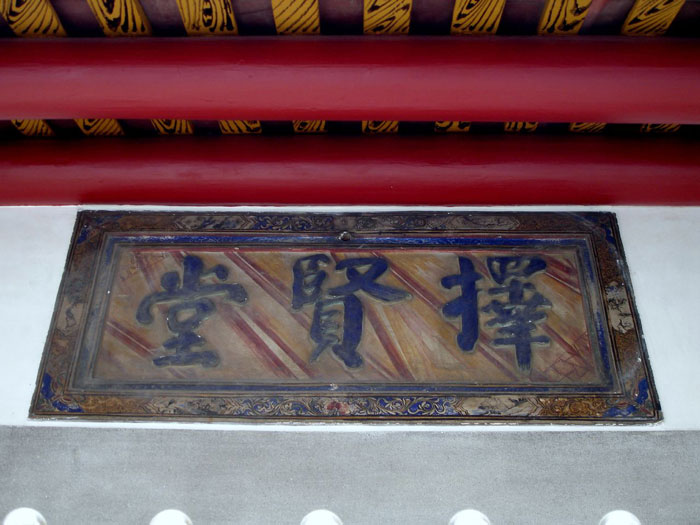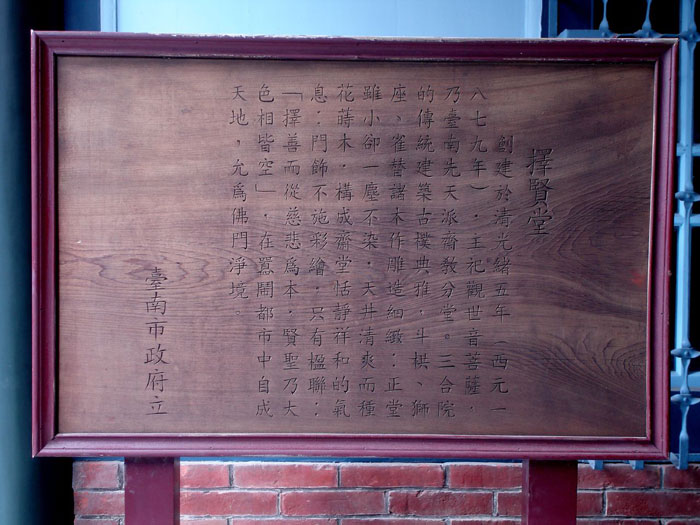 择贤堂,主祀观音佛祖,是先天派的斋堂。所谓斋堂,乃是斋教的佛堂,俗称菜堂。斋教是佛教的一支,源于临济宗,以不削发、不出家、在家修性为主。台南的斋教有龙华、金幢、先天等三派。先天派乃是康熙(西元1662年)年间江西饶州府“黄九祖”创立的宗派,清咸丰11年辛西(西元1861年)由“黄昌成”传入台港,初建报恩堂。清光绪5年(西元1879年),先天派由于信徒增加快速,报恩堂已不敷使用,于是又在报恩堂附近设择贤堂,主要创始人包括“叶昌贞”、“黄昌泰”、“古昌瑞”三人;日治时代(西元1928年)重建庙宇建筑,今日所见到的建筑,即在此次重建中奠定基础的;光复后及民国60年(西元 1971年)均曾加以整修。