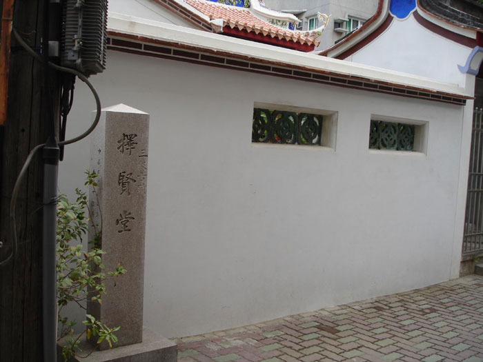 择贤堂坐东朝西,是一座三合院的建筑,位于繁嚣街区的巷道中,由院墙围起,气氛格外幽雅清静。空间格局和传统民宅三合院形式相似,正殿北侧另外有一座三合院古厝,亦为择贤堂所有。墙中央设单开间山门,门内是大小适度的院落,也是通达在右厢房和正堂的核心。正堂虽不宽大,却有四柱式的卷棚拜亭,做为堂内与堂外的空间延续。拜亭大木结构精雕细琢;方形截面的搭梁上,莲座草与狮座并立,承接来自两屋坡的挑桁,是力的结合,也是美的造化。堂前明间计开三门,额题“择贤堂”。在顶桌上方供置的“老母灯”和“大水瓶”乃是先天派斋堂的特色之一,可惜今日以无法见得。唯有在报恩堂正堂的神龛仍可见“老母灯”。木匾、匾额、供桌均为昭和(西元1826年)年间的物品。内部雕刻彩绘作品不多,却精致小巧,制作年代多为昭和(西元1826年)年间。
