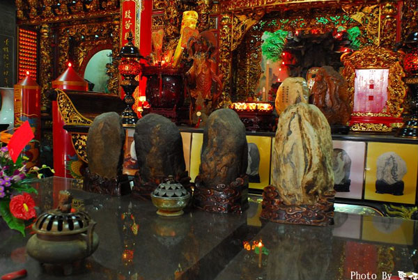丰富鼎盛的香火,和一般传统佛寺有极大的分别,就连龛上供奉的神祇也有相当“功利”的色彩。正供是一百三十年历史的石观音,脸部由于百年来经香烟的熏染已呈黝黑。左右分别是注生娘娘及福德正神,善男信女祈求注生娘娘赐下一男半女,生意人礼拜福德正神〈俗称土地公〉财源滚滚,这和佛教明心见性的观念有显著的不同,民俗信仰在此恐怕为更多的人信仰。
