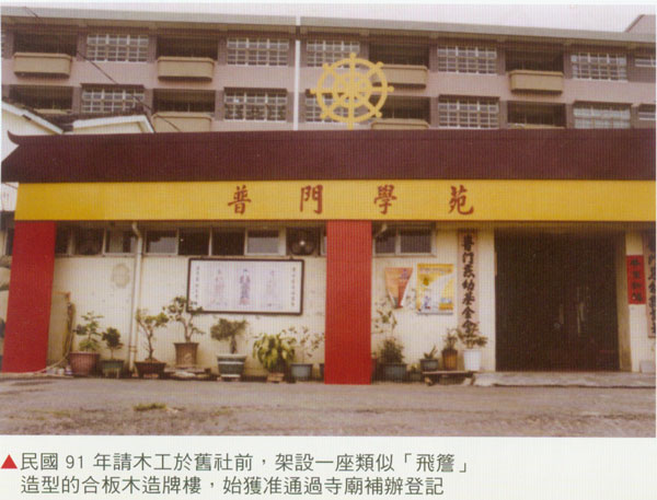 因原地分配重画土地(上地面积约280坪),“普门学苑”缴付给市府高额的土地差额,因此殿堂重建经费拮据,目前尚无经济能力进行重建工程。而“普门学苑”旧址房舍,历经921大地震受损,遂暂以社教会馆“法华堂”为佛堂,领众共修佛法行门,常住僧众则暂寄居社教会馆的3楼“闻思寮”,待他日重建工程完成,始有传统殿堂供常住僧众安住修行,并更进一步弘化如来家业。