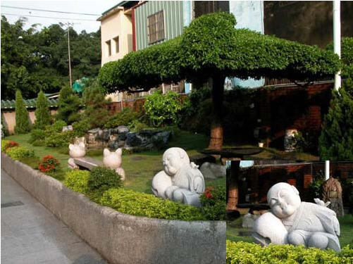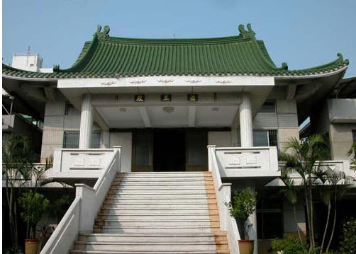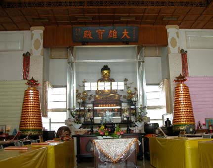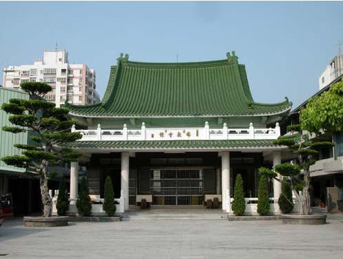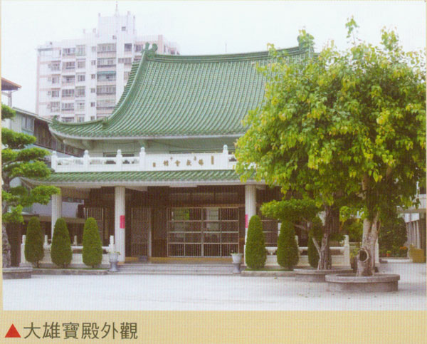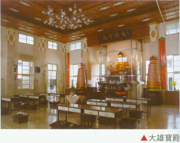 大殿又称前殿,仿照传统的唐式建筑,屋顶盖绿色琉璃瓦,大殿内供奉南无本师释迦牟尼佛。大殿後为法王殿,又称後殿,供奉三宝佛与泰国式造像的金佛。山门依佛教风格牌楼,亦盖以绿色琉璃瓦,与前、後殿成一系列绿色屋瓦体系建筑。後殴有六和堂,为历代住生祖师与住众之莲位。大殿右2楼建筑,1楼为客厅、香椟房、库房、斋堂,後面是方丈室:2楼为大众寮房。大殿左旁2层楼建筑,1楼有客厅、客房,讲堂在後:2楼仍为大众寮房。