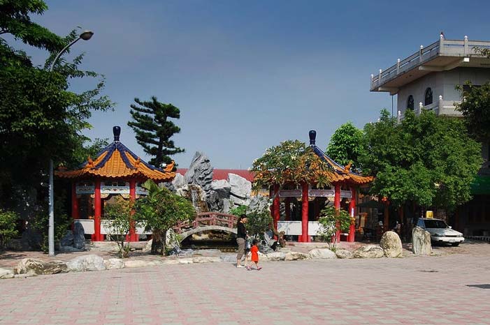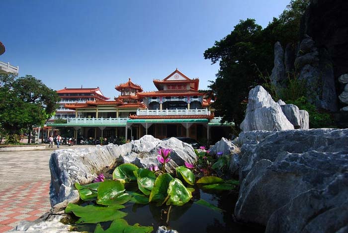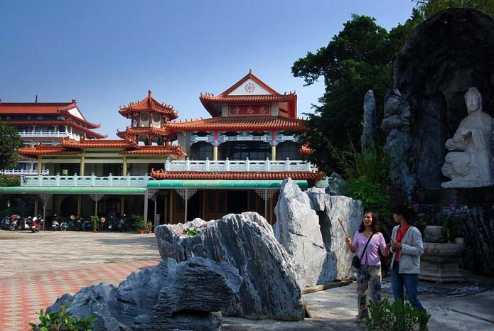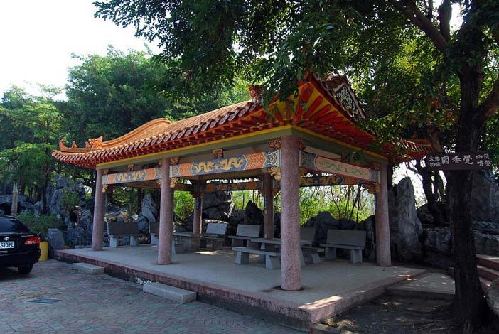 为了能更深入了解布局与认识地方,于是走到本寺的地标-文教大楼顶楼“祥云宝伞”的位置,登高浏览整个屏南平原一览无遗,心神为之一振,不自觉的深呼吸三大口。背山面海,山跟海就在我们两眼之间交会,这种通体舒泰的感觉,非亲临此地无法体会。再看整个慈恩寺布局,由山门右侧起,宛如一条潜龙环绕整个寺院,龙头部份有弥勒佛坐镇,辅以土地公的详和,化解了龙的傲气,让人有温和而安全的感觉。龙的七寸则有观世音菩萨守护著,而喷水池的巧妙设计更让龙能活泼生动悠游于水,自在安然。山门左侧则用巨石,垒叠耸立、气势磅礴,再以土地公形的巨石震住虎口,使不致过于霸气。