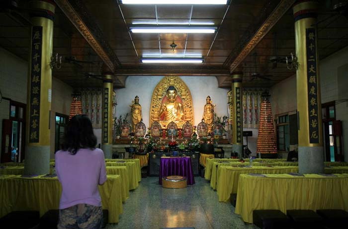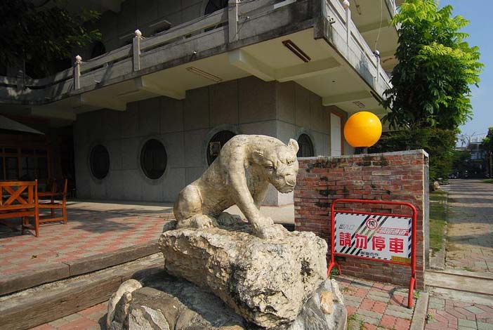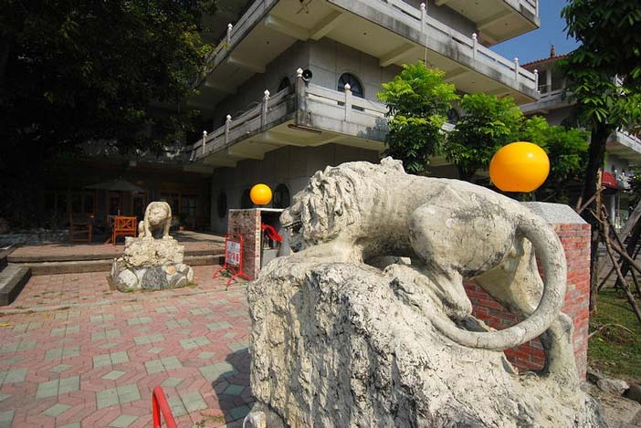 回头一望大殿门口两只狮子,似乎对我们轻声呼唤,乃信步走去,俯前仔细端详,原来这对狮子大有来头,是由海底化石刻成。本来在花莲一位大师的家中安座,只有一只而已,巧妙的因缘,传孝师父路过一见钟情,乃央请主人割爱,以便供在佛寺跟大家结缘,并请其再下海找一颗同质化石,变成一对,主人爽快的答应了,这就是这对狮子来寺的因缘。这对狮子护法也不负众望,任劳任怨的庇佑“慈恩寺”,使师父弘法利生的事业能逐一开展。打过招呼,往大殿右侧楼梯上到二楼大雄宝殿,释迦牟尼佛端坐台上,俯瞰台湾海峡,外岛的小琉球岛隐约可见,犹如本寺的案山,仿佛冥冥之中护法龙神的牵引获此一宝地。
