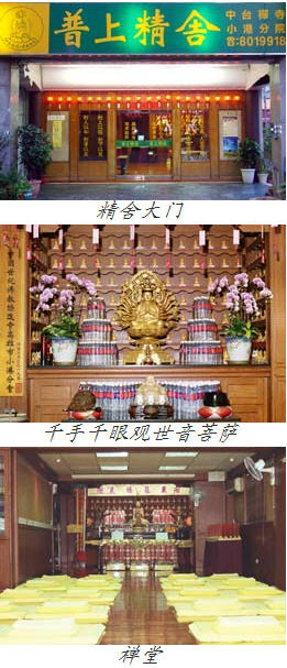 精舍内布置庄严典雅,中央佛龛供奉千手千眼观世音菩萨,观世音菩萨千手千眼慈悲悯念众生,常见路过小朋友、老菩萨向内顶礼问讯,表示对三宝恭敬虔诚之心。左侧为知客柜台,方便接众,提供大众询问各项禅修事宜;右侧为随喜谈禅区,供大众请法及交换禅修心得之用,气氛祥和温馨。