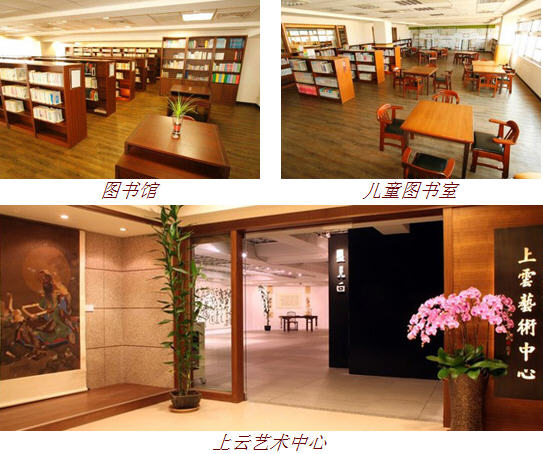 精舍内除大雄宝殿、禅堂、讲堂之外,六楼更设立社区及儿童图书馆,七楼为上云艺术中心,定期举办艺术展览与艺文活动,是社区居民心灵的避风港,每每可见全家人同来薰修佛法的法喜画面。