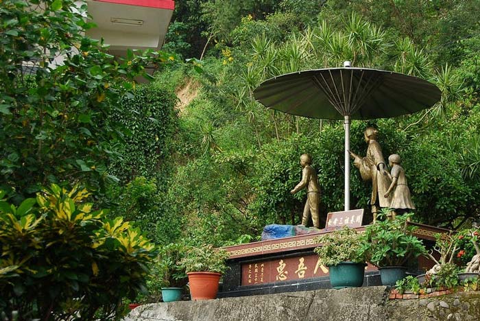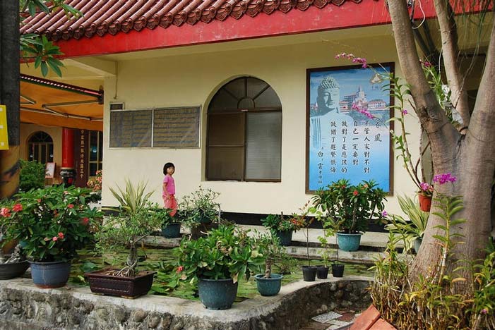 红瓦白墙、简约朴实的福慧寺,背倚绵延的翠峦丛林,远眺缭绕的云影、环抱的群山,朝暮课诵的梵拜余韵回荡阡陌纵横的小镇人家;偌大前庭的旁侧植花莳草、朵朵恬香的莲荷、石桌石凳…,皆是品茗、休憩、观景…的雅坐。依傍山径而上,山门入口处的左侧,可见空旷的停车场、二层楼的大通铺、地藏殿、纳骨塔。再往前行,一旁伫立信众缅怀“开基祖三母女”的铜塑像,栩栩如生的刻画穿著客家服饰的母挽著包袱,戴著两名稚女前行,娓娓的道说荜路蓝缕、披荆斩棘的前尘往事…。