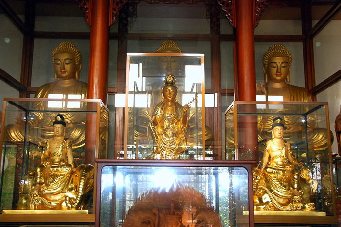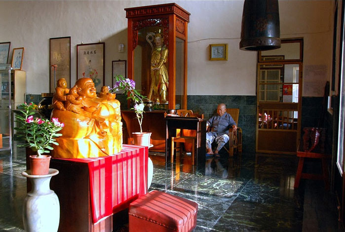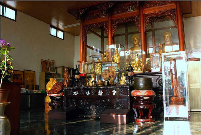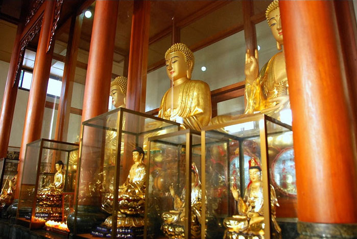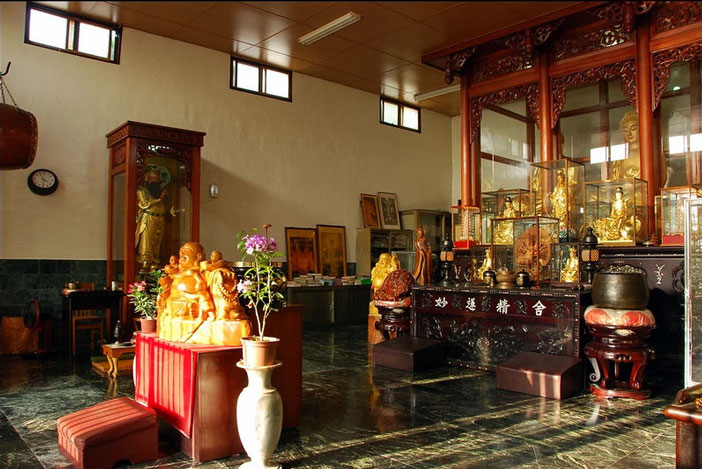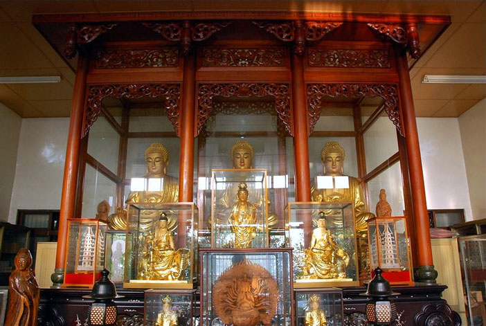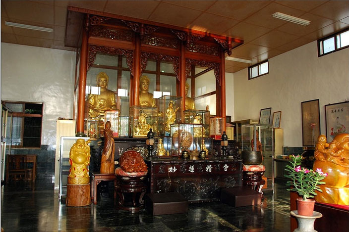大雄宝殿佛龛内供奉坐姿三宝佛:(中为本师释迦牟尼佛,左、右分别为:弥陀佛、药师佛),此外殿前并供奉:观世音、文殊、普贤、地藏王、千手观音及护法(韦驮、伽蓝)菩萨。佛像前以鲜花、盆栽严饰。右厢为接待室,左厢为五观堂及禅房,广场右前方有数颗参天大椿树,夏季供香客憩闲,寺院格局虽受场地限制不甚广阔,但每逢寺院举行各项法会或重大佛事庆祝活动时,形成数百人活动壮观。