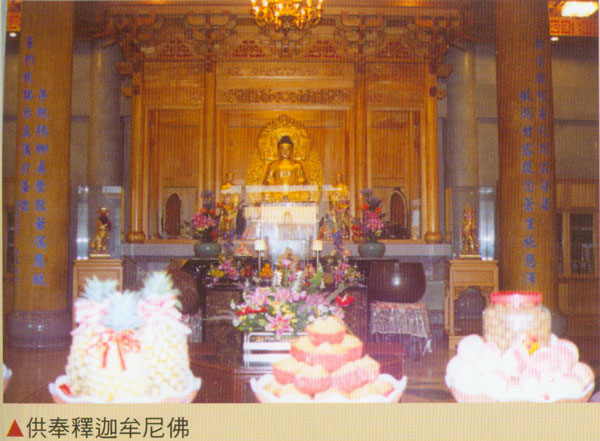 大殿建造成3层楼式,土楼为圆通宝殿,正中内层:供奉教主释迦牟尼佛,两边是阿难、迦叶尊者。中层:供奉观世音菩萨,两边是善财、龙女。外层:供奉早期由桃园龟山乡寿山岩迎来的观音佛祖。2楼为大雄宝殿,供奉华严三圣:中为昆卢遮那佛,两边是文殊、普贤两大菩萨,皆是缅甸白玉精致雕刻而成。3楼为“藏经阁”陈列大藏经、华严经、妙法莲华经等诸多经典。从外观而望大殿高度有6层楼之高,两边厢房是3层楼建筑,屋顶盖琉璃瓦,十分巍峨庄严,纯是北方佛刹的形态。寺前广场铺设石板砖,正侧三面回廊环绕,回廊正面中间壁堵是“二十四尊天”的浮雕天人像。