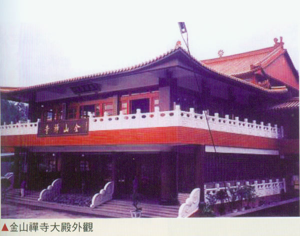 金山禅寺坐东朝西,三面环抱青山,呈凸字型两层楼黄琉璃瓦的半传统式建筑,占地约600坪。寺内供奉观世音菩萨,大智文殊菩萨、大行普贤菩萨、护法韦驮尊天菩萨、伽蓝菩萨、释迦如来。两侧各有厢房,旁有斋堂l栋。