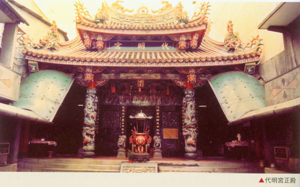 代明宫创建於清咸丰11(1861)年,由基隆街绅张赐欢居士(法号普汉,曾赴鼓山涌泉寺皈依,後入福州“一是堂”受法为龙华派传灯,列二品太空)纠合同道发起兴建,为基隆最早之斋教龙华派佛堂,初名为“源斋堂”,设堂址於基隆街後井仔,同治2(1863)年落成,张赐欢居士为初代堂主兼管理人。