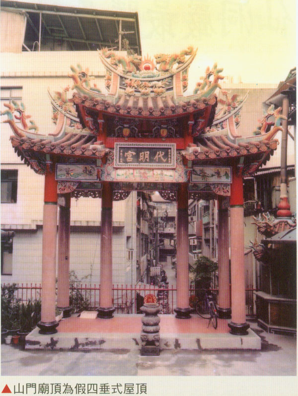 代明宫格局为坐南朝北,呈现南体风貌,山门庙顶为假四垂式屋顶,气派宏伟。正殿供奉三宝佛,中殿奉祀太阳、太阴星君,後殿供奉观世音菩萨。