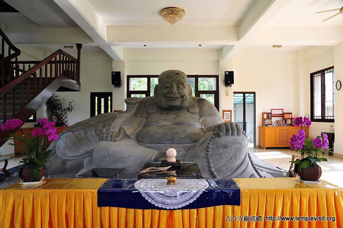 据了解,寺方请来台北县八里的一组石雕师父,就巨石原来形貌刻出一尊倚著石头而坐的弥勒佛,因为石块坚硬,雕凿困难,师父花了四个月时间才完成壮观的石像,如来殿的设计、格局,完全迁就占地八坪的神像而建。甫完成的唐式“如来殿”,白墙衬映蓝色琉璃瓦的外观庄严巍峨,四面是超大玻璃窗,由殿外就看得到端坐殿中的巨大石像,入殿后望之令人感到法喜与讶叹。当时南庄乡长李清枝表示,这尊大佛最难得之处是用蓬莱当地原石刻成,巨石原本外覆黄土,看来其貌不扬,雕凿后成为灰黑色的庄严神像,为全台罕见。
