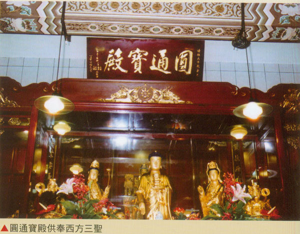 为传统三川脊式寺院建筑,分前後两殿,正殿为圆通宝殿,主供释迦牟尼佛与观世音菩萨等,并设地藏殿、福德宫及2楼讲堂。