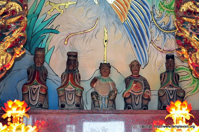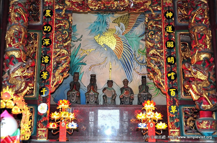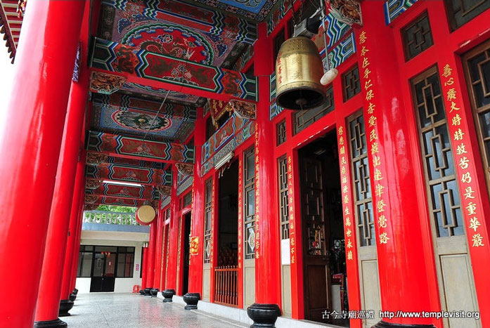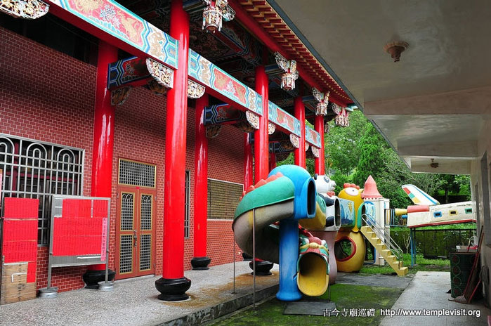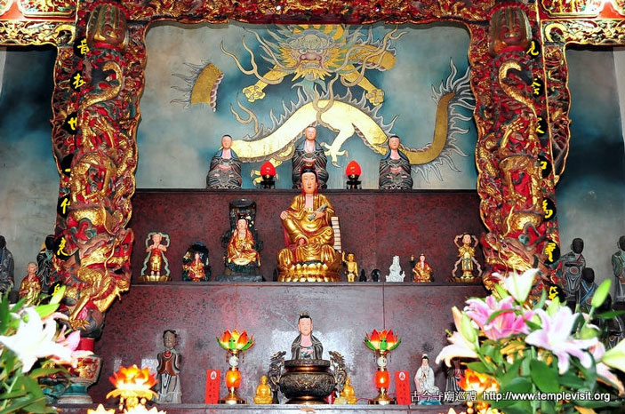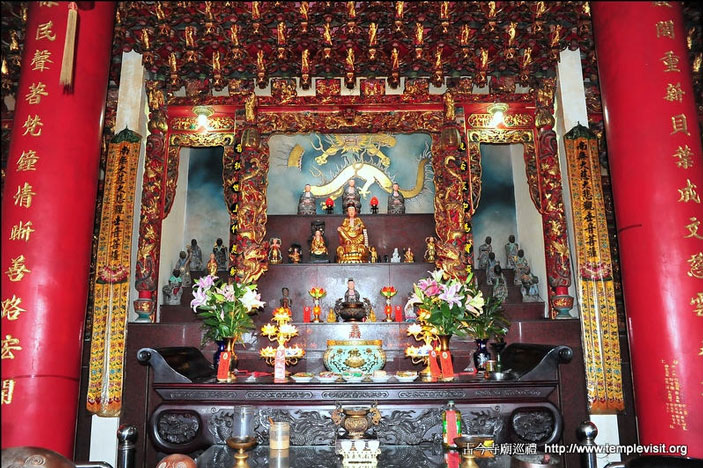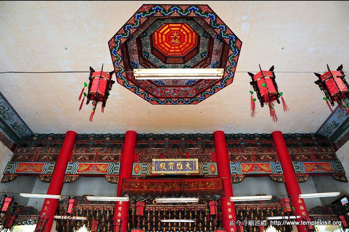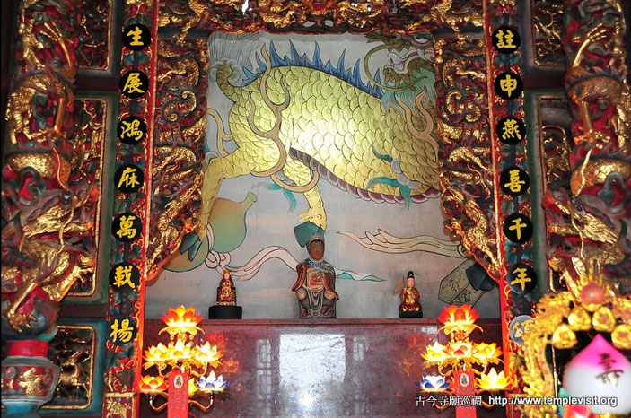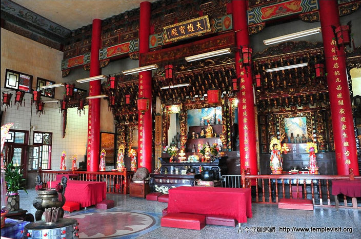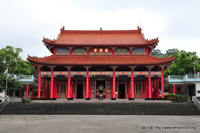 为一座独立重檐歇山北方佛教式建筑,建筑简单宏伟,四周檐廊每边都有8根高达3层楼的红色廊柱,顶上2层橘色琉璃瓦出色不少。开基时期供奉有观音、善财、龙女、释迦、药师、阿弥陀佛、城隍、神农及十八罗汉,皆由大陆渡海来台湾,造型古朴典雅,小巧玲珑,尊尊皆仅1尺左右高度,而历史却超过200年以上,十足珍贵。