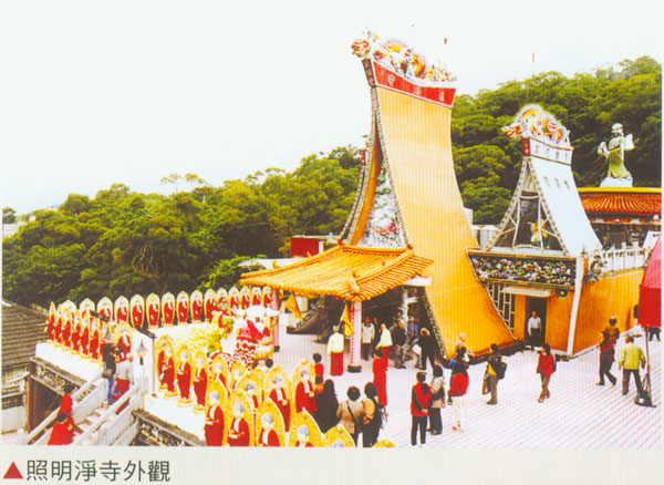 照明净寺位于威灵顿山庄内,依山势而建,大北投的景致尽收眼底,视野奇佳,登上石阶,大殿供奉三宝佛,右侧有泰式建筑的观音大宝殿:另设地藏殿、逯天亭、五百罗汉亭、许愿池及客堂、寮房等。