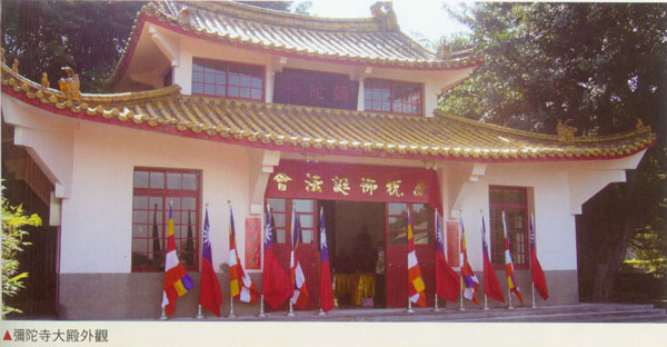 北投弥陀寺位於新北投往阳明山约两公里路,建於民国41年10月间,占地约有200坪。现在的大殿原是放置农具的工寮,石砌墙面,茅草覆盖,据说每逢入夜,时现红面关公,致使居民下敢占用。右边的念佛堂,面积不大,原是日式2层楼房,桧木材质,精巧雅致。屋外空地,中有小池,三五棵大榕树环绕於外,位置隐密,景致幽雅。