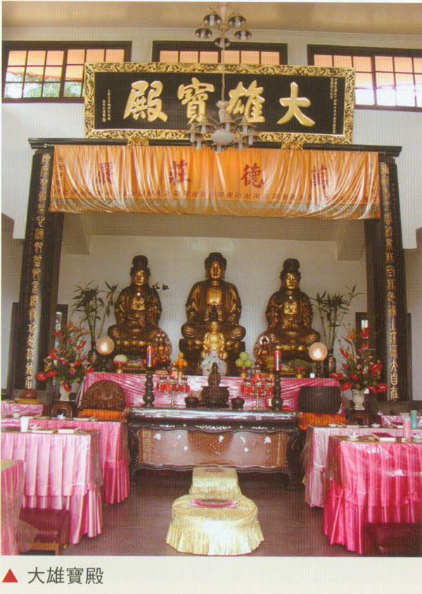 因受地形限制,全寺分为大雄宝殿、斋堂、寮房及念佛堂、功德堂等部分:闽南风格之大殿采重檐廉殿式建筑,上覆金黄色琉璃瓦,主供西方三圣。大殿左侧为功德堂,念佛堂则位於右侧,其上为禅房。大寮、斋堂及会客厅则独立於另一区。